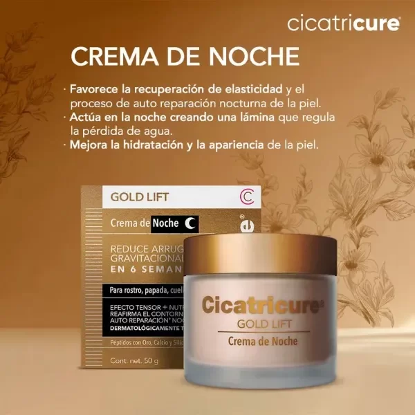 Cicatricure Gold Lift crema facial de noche combina el poder de los péptidos con oro, calcio y silicio reduciendo la profundidad de las arrugas gravitacionales y redefiniendo el contorno facial.